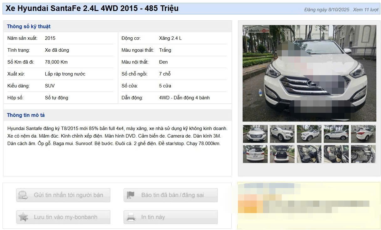 Hyundai SantaFe 2.4L 4WD đời 2015 được rao bán với giá 485 triệu đồng, sau khi đã chạy 78.000 km.
